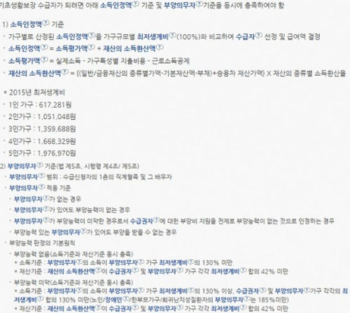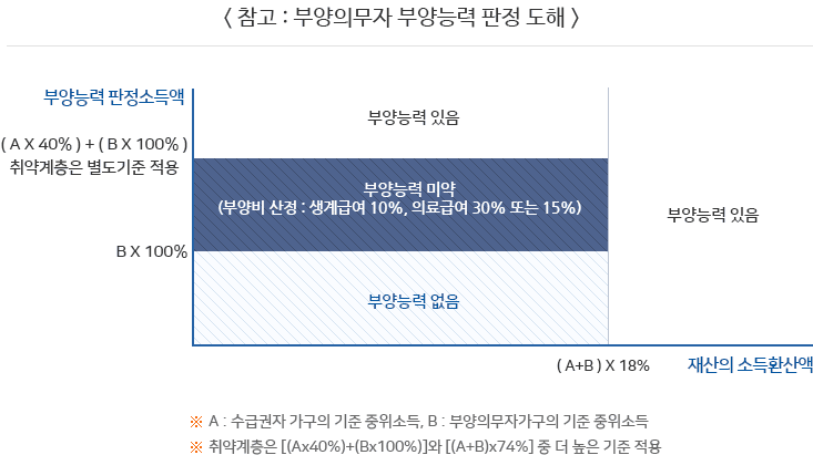 그리고 부양의무자라는 것은 수급자 신청자의 가족 구성원을 책임질 수 있는 또 다른 가족을 말합니다. 그래서 예를 들면 배우자가 있고 부모 및 형제 등이 여기에 해당됩니다. 그러기 때문에 소득인정액이 통과되더라도 부양의무자 기준을 통과하지 못하다 보면 수급자 혜택을 받아볼 수 없습니다.