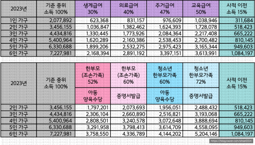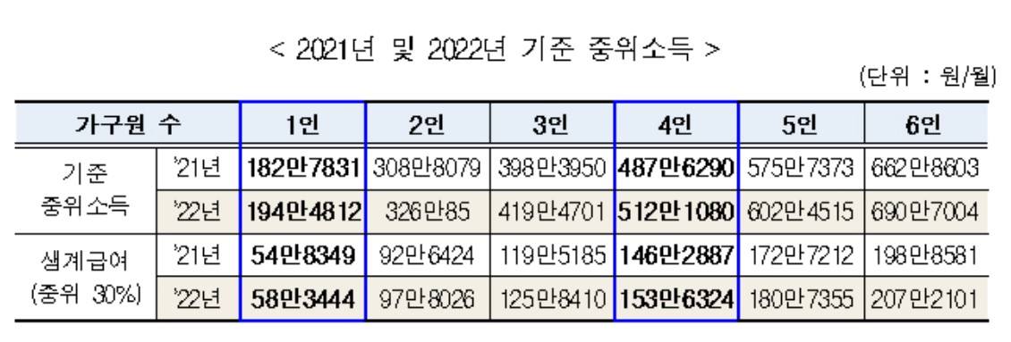 2023년 기준중위소득은 매년 물가 상승률을 반영하여 적용을 하기 때문에 올해도 인상이 되었는데요. 2023년 기준중위소득은 1인가구 2,077,892원, 2인 가구 3,456,155원, 3인 가구 4,434,816원, 4인 가구 5,400,964원으로 인상이 되었습니다.