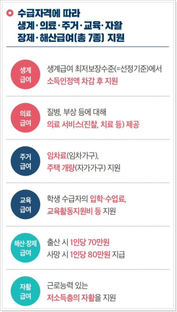 중위소득을 기준으로 생계급여, 의료급여, 주거급여, 교육급여가 결정되게 됩니다. 급여종류와 가구원수에 따라 기준이 달라집니다.