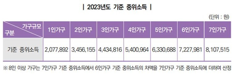 아래에 첨부한 표를 확인하시면 7인 가구까지만 명시되어 있는데요. 1인 증가 시 6인 가구 기준과 7인가구 기준 차이를 7인가구에 더하셔서 산정하시면 됩니다.