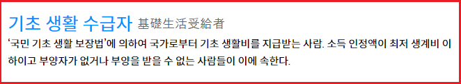 기초생활수급자는 부양 의무자가 없거나 혹은 부양 의무자가 있는 상태더라도 부양 능력이 없고 부양을 받을 수 없는 사람을 의미합니다. 소득 인정액이 최저 생계비 이하인 경우 해당되는데, 이런 경제적인 어려움으로 생활이 힘든 사람들을 대상으로 최저생활비를 정부에서 일정 금액 지원해주는 제도를 기초생활보장제도라고 합니다.