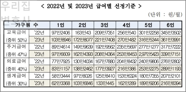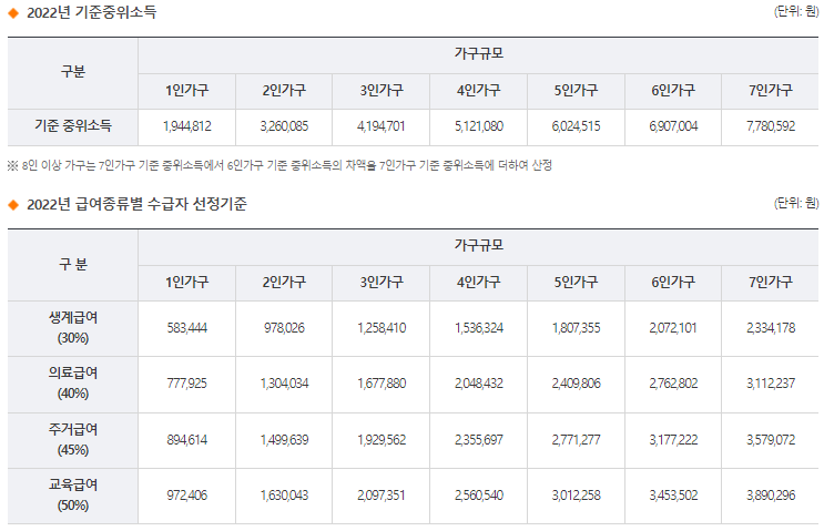 2023년 기준 중위소득을 기준으로 생계급여 수급자는 중위소득에 30%, 의료급여 수급자는 중위소득에 40%, 주거급여 수급자 중위소득에 47%, 교육급여 수급자 중위소득에 50%로 보면 됩니다.