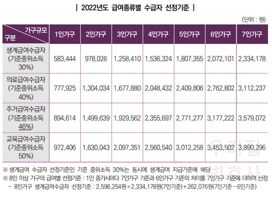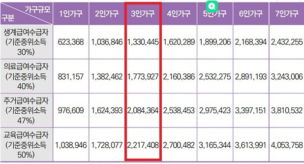 종류별 수급자 선정기준을 보면 3인 가구를 기준으로 보면 생계급여는 1,330,445원, 의료급여 1,773,927원, 주거급여 2,084,364원, 교육급여 2,217,408원 이하인 경우 수급자에 선정이 됩니다.