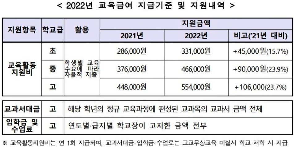 교육급여는 학용품비, 부교재비, 교과서대, 수업료, 입학금를 지원합니다. 그래서 가정에 자녀가 초, 중, 고에 재학 중이라고 하다 보면 자녀의 면학을 위하여 국가가 돕는 제도로 소득인정액이 중위소득 50% 이하인 분에게 지급됩니다.