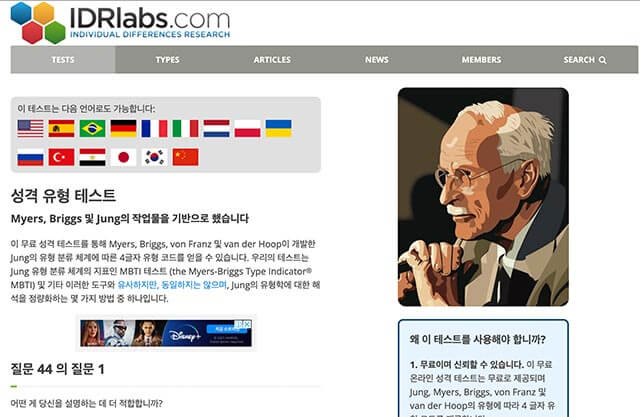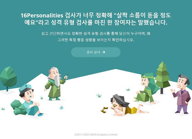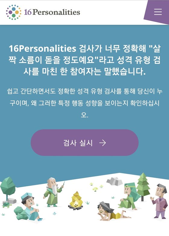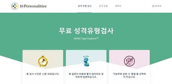 16 personalities 는 사람들이 가장 많이 찾는 mbti 성격 유형검사 무료 검사가 가능한 사이트입니다. 검사 시간은 약 12분 정도로 짧고 결과를 바로 확인 할 수 있습니다. 다만 전문성을 가지는 정확한 결과는 아니니 본인의 성향을 이해하는 정도로만 사용하시면 좋습니다.